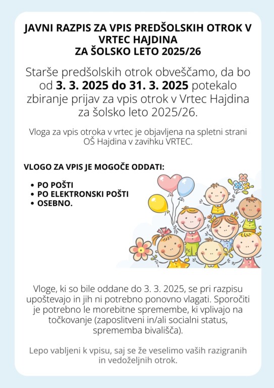 JAVNI RAZPIS ZA VPIS V VRTEC HAJDINA V ŠOLSKEM LETU 2025/2026